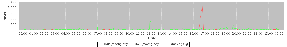 max(MsgActionRequest.move) = 235.00 max(SearchRequest) = 1068.00 max(GetContactsRequest) = 730.00 max(MsgActionRequest.delete) = 746.00 max(NoOpRequest) = 296.00 max(MsgActionRequest.update) = 234.00 max(GetFolderRequest) = 449.00 max(SyncRequest) = 629.00 max(SearchGalRequest) = 182.00 max(GetAppointmentRequest) = 1837.00