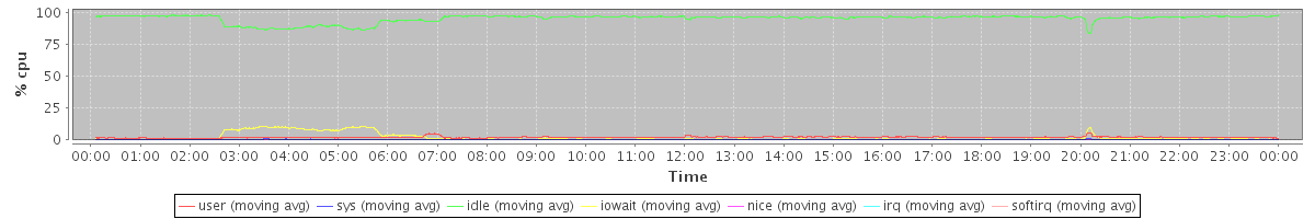 avg(user) = 2.06 avg(sys) = 0.30 avg(idle) = 95.57 avg(iowait) = 1.92 avg(nice) = 0.09 avg(irq) = 0.00 avg(softirq) = 0.05