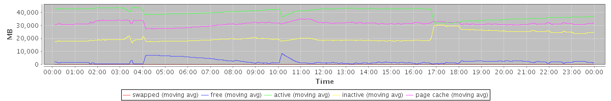 avg(swapped) = 8.76 avg(free) = 2288.06 avg(active) = 39364.35 avg(inactive) = 20911.20 avg(page cache) = 31280.12