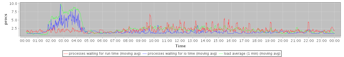 avg(processes waiting for run time) = 1.29 avg(processes waiting for io time) = 0.85 avg(load average (1 min)) = 2.45