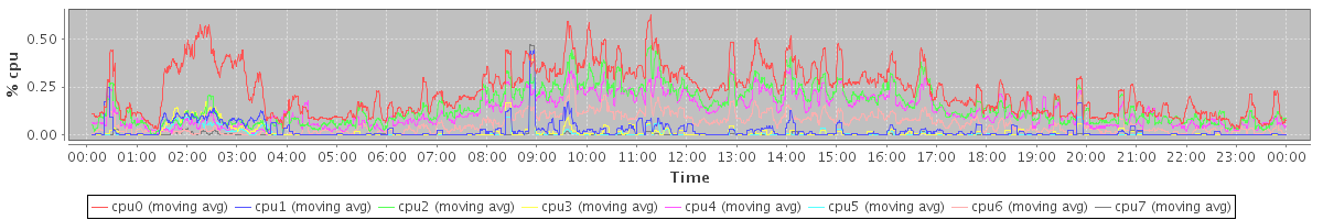 avg(cpu0) = 0.23 avg(cpu1) = 0.02 avg(cpu2) = 0.15 avg(cpu3) = 0.01 avg(cpu4) = 0.12 avg(cpu5) = 0.01 avg(cpu6) = 0.06 avg(cpu7) = 0.00