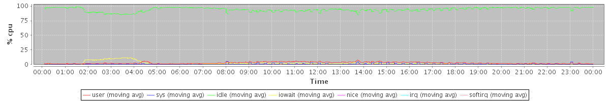 avg(user) = 2.85 avg(sys) = 0.73 avg(idle) = 94.26 avg(iowait) = 2.01 avg(nice) = 0.10 avg(irq) = 0.00 avg(softirq) = 0.07