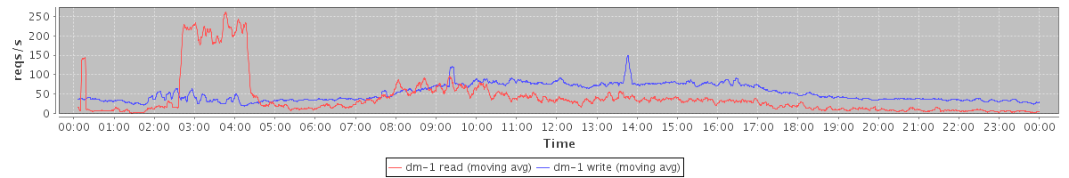 avg(dm-1 read) = 673.25 avg(dm-1 write) = 1190.11