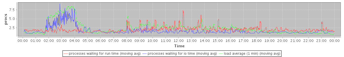 avg(processes waiting for run time) = 1.23 avg(processes waiting for io time) = 0.82 avg(load average (1 min)) = 2.38