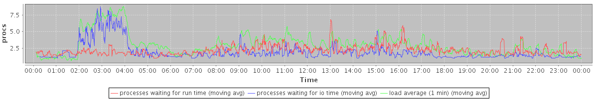 avg(processes waiting for run time) = 1.59 avg(processes waiting for io time) = 1.29 avg(load average (1 min)) = 3.02
