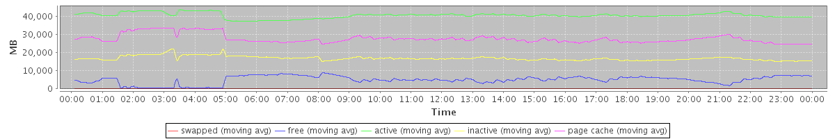 avg(swapped) = 9.29 avg(free) = 4946.16 avg(active) = 40634.96 avg(inactive) = 16898.69 avg(page cache) = 27773.12
