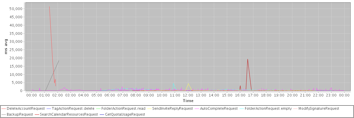 avg(DeleteAccountRequest) = 15226.17 avg(TagActionRequest.delete) = 1467.00 avg(FolderActionRequest.read) = 725.00 avg(SendInviteReplyRequest) = 271.27 avg(AutoCompleteRequest) = 293.66 avg(FolderActionRequest.empty) = 672.95 avg(ModifySignatureRequest) = 305.60 avg(BackupRequest) = 9344.00 avg(SearchCalendarResourcesRequest) = 282.40 avg(GetQuotaUsageRequest) = 1076.00