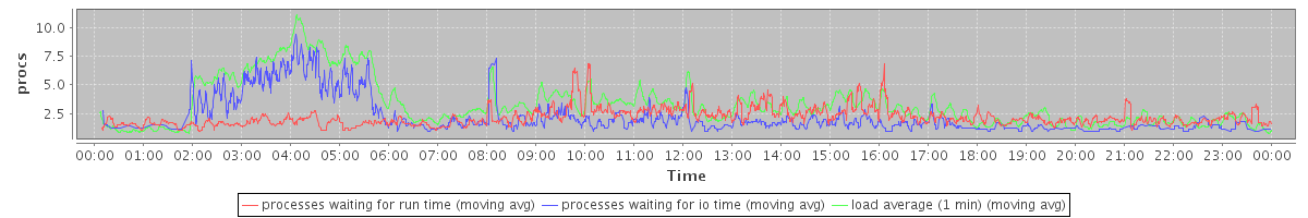 avg(processes waiting for run time) = 1.61 avg(processes waiting for io time) = 1.50 avg(load average (1 min)) = 3.28