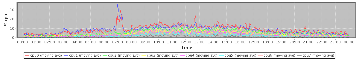 avg(cpu0) = 8.89 avg(cpu1) = 8.38 avg(cpu2) = 5.69 avg(cpu3) = 4.38 avg(cpu4) = 3.67 avg(cpu5) = 2.27 avg(cpu6) = 4.42 avg(cpu7) = 1.28