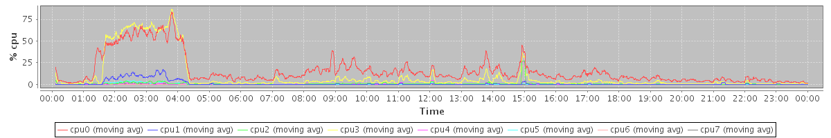 avg(cpu0) = 15.43 avg(cpu1) = 1.09 avg(cpu2) = 0.67 avg(cpu3) = 9.58 avg(cpu4) = 0.45 avg(cpu5) = 0.27 avg(cpu6) = 0.17 avg(cpu7) = 0.09