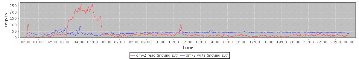 avg(dm-1 read) = 2150.14 avg(dm-1 write) = 415.21