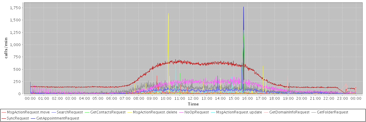 max(MsgActionRequest.move) = 368.00 max(SearchRequest) = 633.00 max(GetContactsRequest) = 1298.00 max(MsgActionRequest.delete) = 1640.00 max(NoOpRequest) = 346.00 max(MsgActionRequest.update) = 663.00 max(GetDomainInfoRequest) = 366.00 max(GetFolderRequest) = 306.00 max(SyncRequest) = 700.00 max(GetAppointmentRequest) = 1770.00