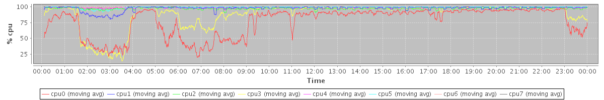 avg(cpu0) = 19.26 avg(cpu1) = 0.88 avg(cpu2) = 0.25 avg(cpu3) = 10.01 avg(cpu4) = 0.12 avg(cpu5) = 0.27 avg(cpu6) = 0.03 avg(cpu7) = 0.07
