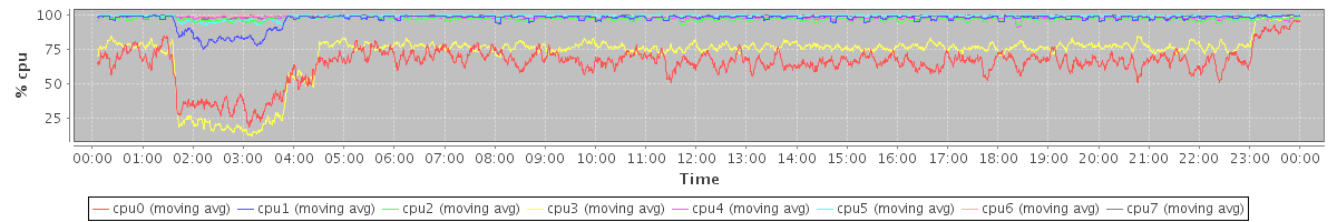avg(cpu0) = 3.47 avg(cpu1) = 1.27 avg(cpu2) = 2.14 avg(cpu3) = 1.49 avg(cpu4) = 1.63 avg(cpu5) = 0.38 avg(cpu6) = 0.78 avg(cpu7) = 0.23