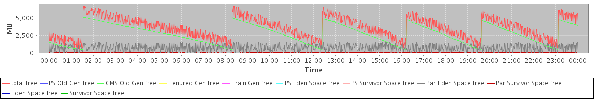 avg(total free) = 3645.68 avg(PS Old Gen free) = 0.00 avg(CMS Old Gen free) = 2739.29 avg(Tenured Gen free) = 0.00 avg(Train Gen free) = 0.00 avg(PS Eden Space free) = 0.00 avg(PS Survivor Space free) = 0.00 avg(Par Eden Space free) = 808.55 avg(Par Survivor Space free) = 97.83 avg(Eden Space free) = 0.00 avg(Survivor Space free) = 0.00