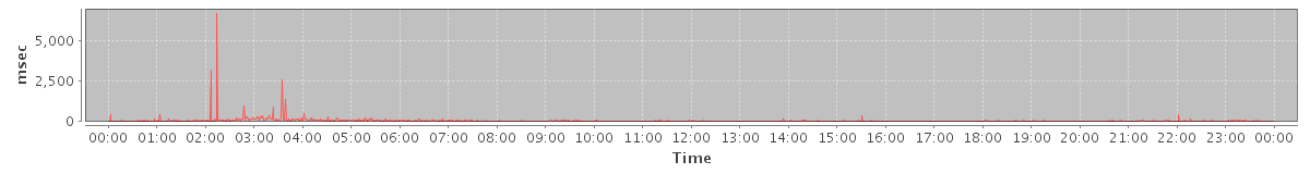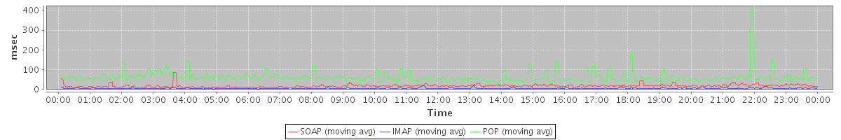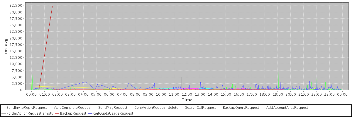 avg(SendInviteReplyRequest) = 181.80 avg(AutoCompleteRequest) = 473.89 avg(SendMsgRequest) = 218.55 avg(ConvActionRequest.delete) = 362.52 avg(SearchGalRequest) = 264.62 avg(BackupQueryRequest) = 670.00 avg(AddAccountAliasRequest) = 156.00 avg(FolderActionRequest.empty) = 1150.20 avg(BackupRequest) = 16402.50 avg(GetQuotaUsageRequest) = 1187.00