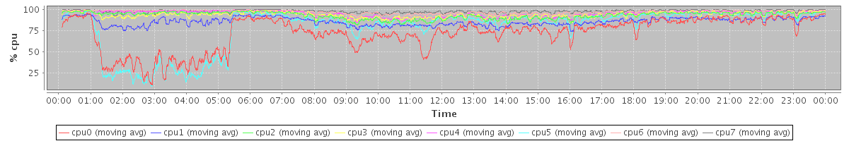 avg(cpu0) = 18.49 avg(cpu1) = 1.82 avg(cpu2) = 0.64 avg(cpu3) = 0.71 avg(cpu4) = 0.40 avg(cpu5) = 15.55 avg(cpu6) = 0.13 avg(cpu7) = 0.27