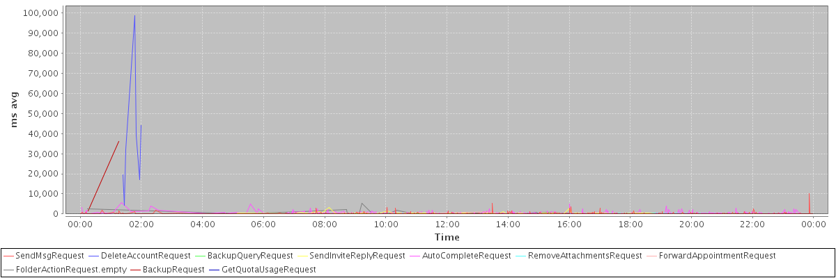 avg(SendMsgRequest) = 233.30 avg(DeleteAccountRequest) = 36436.57 avg(BackupQueryRequest) = 238.40 avg(SendInviteReplyRequest) = 388.73 avg(AutoCompleteRequest) = 388.72 avg(RemoveAttachmentsRequest) = 279.25 avg(ForwardAppointmentRequest) = 697.00 avg(FolderActionRequest.empty) = 537.36 avg(BackupRequest) = 18838.50 avg(GetQuotaUsageRequest) = 1013.00