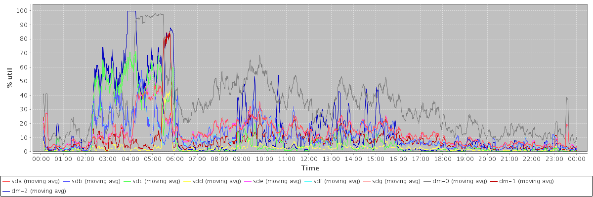 avg(sda) = 13.45 avg(sdb) = 11.25 avg(sdc) = 9.60 avg(sdd) = 2.66 avg(sde) = 13.47 avg(sdf) = 11.22 avg(sdg) = 9.62 avg(dm-0) = 32.59 avg(dm-1) = 8.05 avg(dm-2) = 15.98