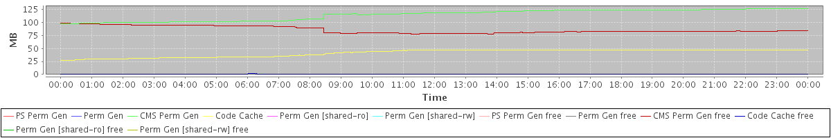avg(PS Perm Gen) = 0.00 avg(Perm Gen) = 0.00 avg(CMS Perm Gen) = 114.80 avg(Code Cache) = 41.68 avg(Perm Gen [shared-ro]) = 0.00 avg(Perm Gen [shared-rw]) = 0.00 avg(PS Perm Gen free) = 0.00 avg(Perm Gen free) = 0.00 avg(CMS Perm Gen free) = 85.96 avg(Code Cache free) = 0.40 avg(Perm Gen [shared-ro] free) = 0.00 avg(Perm Gen [shared-rw] free) = 0.00