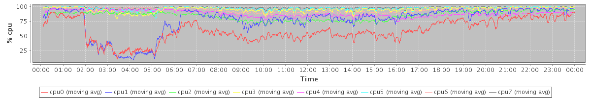 avg(cpu0) = 26.85 avg(cpu1) = 17.29 avg(cpu2) = 1.12 avg(cpu3) = 1.31 avg(cpu4) = 0.98 avg(cpu5) = 0.46 avg(cpu6) = 0.36 avg(cpu7) = 0.22