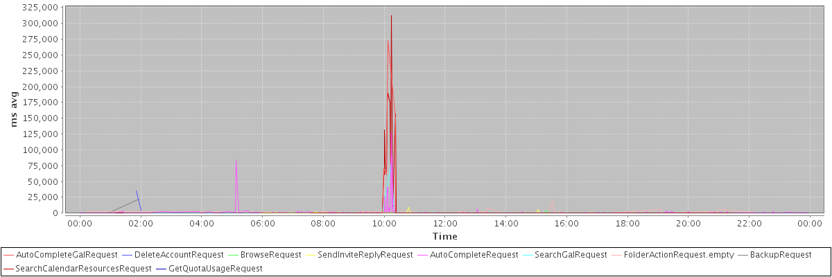 avg(AutoCompleteGalRequest) = 3331.46 avg(DeleteAccountRequest) = 20437.00 avg(BrowseRequest) = 1975.50 avg(SendInviteReplyRequest) = 494.30 avg(AutoCompleteRequest) = 999.19 avg(SearchGalRequest) = 1524.57 avg(FolderActionRequest.empty) = 1642.40 avg(BackupRequest) = 11391.00 avg(SearchCalendarResourcesRequest) = 9982.77 avg(GetQuotaUsageRequest) = 2641.00