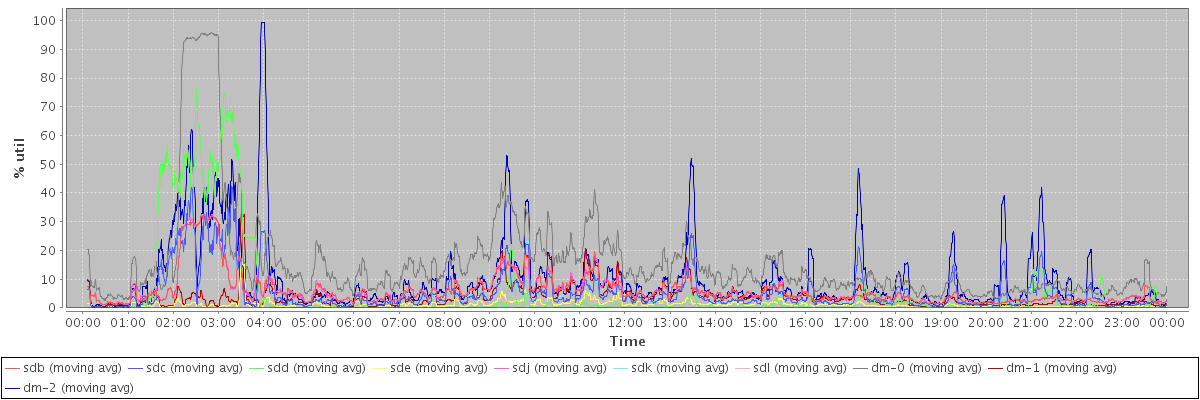 avg(sdb) = 6.04 avg(sdc) = 5.28 avg(sdd) = 5.40 avg(sde) = 1.11 avg(sdj) = 6.04 avg(sdk) = 5.30 avg(sdl) = 5.41 avg(dm-0) = 15.77 avg(dm-1) = 3.62 avg(dm-2) = 10.20