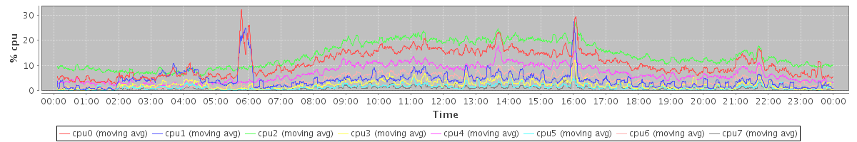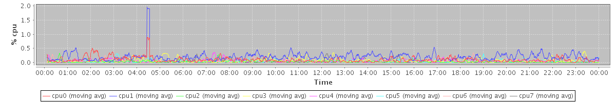 avg(cpu0) = 0.49 avg(cpu1) = 0.14 avg(cpu2) = 0.36 avg(cpu3) = 0.10 avg(cpu4) = 0.30 avg(cpu5) = 0.05 avg(cpu6) = 0.19 avg(cpu7) = 0.02