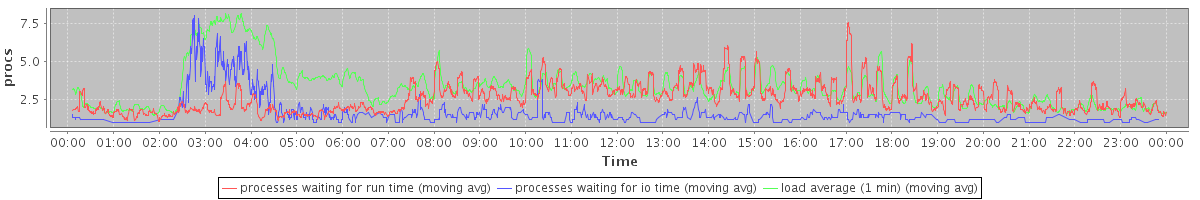 avg(processes waiting for run time) = 2.59 avg(processes waiting for io time) = 0.85 avg(load average (1 min)) = 3.33