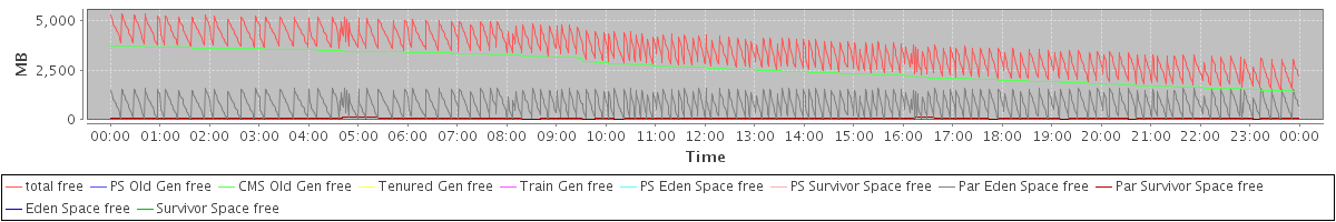 avg(total free) = 3540.11 avg(PS Old Gen free) = 0.00 avg(CMS Old Gen free) = 2667.41 avg(Tenured Gen free) = 0.00 avg(Train Gen free) = 0.00 avg(PS Eden Space free) = 0.00 avg(PS Survivor Space free) = 0.00 avg(Par Eden Space free) = 803.13 avg(Par Survivor Space free) = 69.57 avg(Eden Space free) = 0.00 avg(Survivor Space free) = 0.00