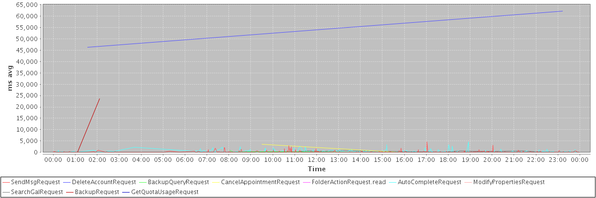 avg(SendMsgRequest) = 182.12 avg(DeleteAccountRequest) = 54186.00 avg(BackupQueryRequest) = 304.40 avg(CancelAppointmentRequest) = 1278.00 avg(FolderActionRequest.read) = 939.00 avg(AutoCompleteRequest) = 347.52 avg(ModifyPropertiesRequest) = 249.00 avg(SearchGalRequest) = 454.61 avg(BackupRequest) = 11888.50 avg(GetQuotaUsageRequest) = 1013.00