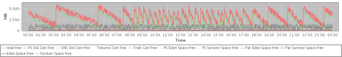 avg(total free) = 3224.31 avg(PS Old Gen free) = 0.00 avg(CMS Old Gen free) = 2334.69 avg(Tenured Gen free) = 0.00 avg(Train Gen free) = 0.00 avg(PS Eden Space free) = 0.00 avg(PS Survivor Space free) = 0.00 avg(Par Eden Space free) = 811.15 avg(Par Survivor Space free) = 78.46 avg(Eden Space free) = 0.00 avg(Survivor Space free) = 0.00