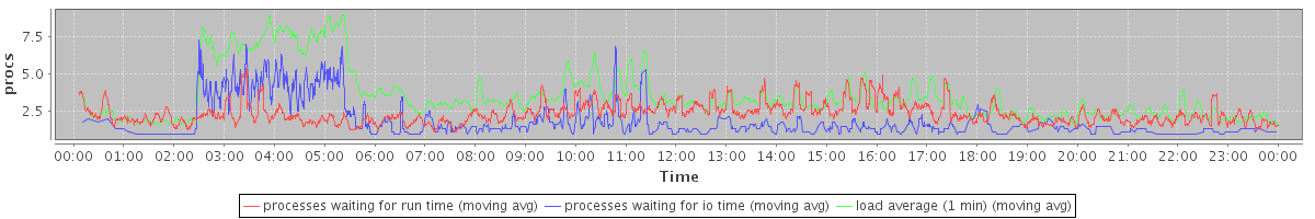avg(processes waiting for run time) = 2.37 avg(processes waiting for io time) = 1.03 avg(load average (1 min)) = 3.55