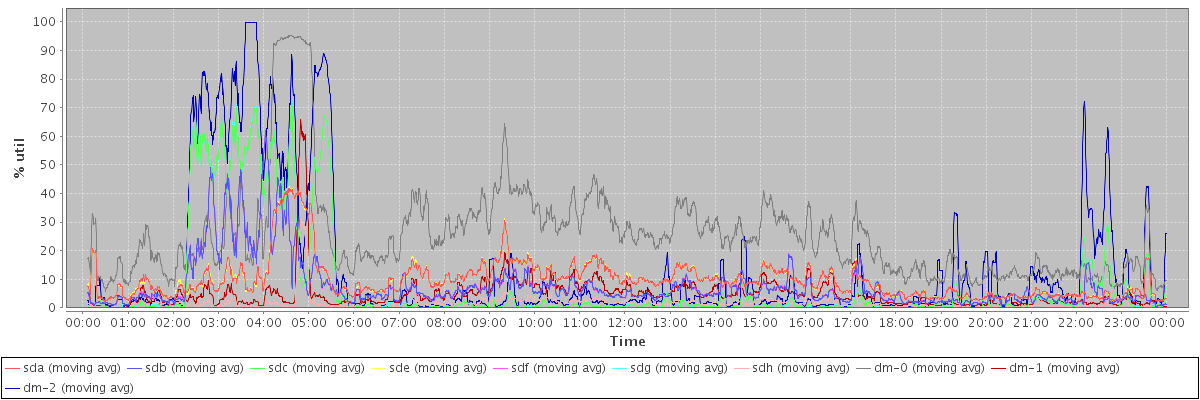 avg(sda) = 9.82 avg(sdb) = 7.61 avg(sdc) = 8.15 avg(sde) = 9.84 avg(sdf) = 7.61 avg(sdg) = 8.19 avg(sdh) = 1.54 avg(dm-0) = 25.46 avg(dm-1) = 4.86 avg(dm-2) = 13.82