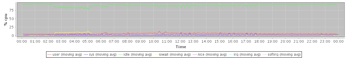 avg(user) = 5.55 avg(sys) = 2.03 avg(idle) = 90.07 avg(iowait) = 2.21 avg(nice) = 0.10 avg(irq) = 0.00 avg(softirq) = 0.07