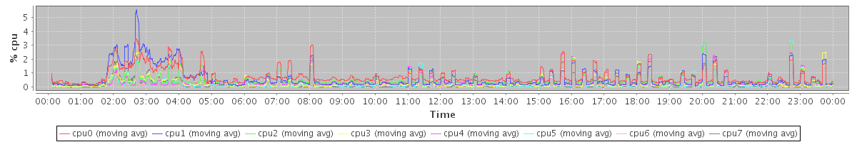 avg(cpu0) = 0.05 avg(cpu1) = 0.16 avg(cpu2) = 0.01 avg(cpu3) = 0.03 avg(cpu4) = 0.01 avg(cpu5) = 0.03 avg(cpu6) = 0.02 avg(cpu7) = 0.01