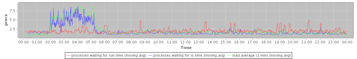 avg(processes waiting for run time) = 1.16 avg(processes waiting for io time) = 1.04 avg(load average (1 min)) = 2.22