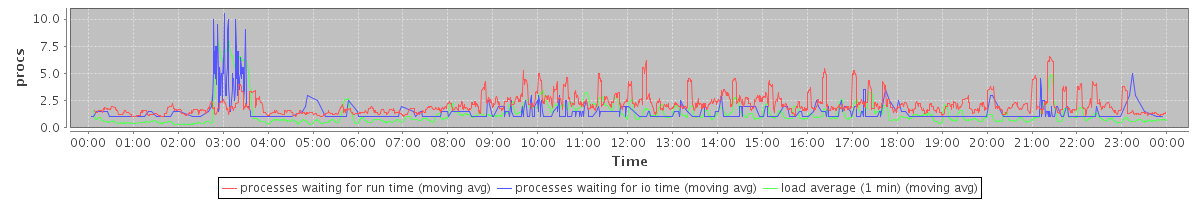 avg(processes waiting for run time) = 1.49 avg(processes waiting for io time) = 0.36 avg(load average (1 min)) = 1.32