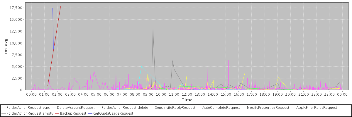 avg(FolderActionRequest.sync) = 801.00 avg(DeleteAccountRequest) = 13011.50 avg(FolderActionRequest.delete) = 378.50 avg(SendInviteReplyRequest) = 447.26 avg(AutoCompleteRequest) = 383.87 avg(ModifyPropertiesRequest) = 434.05 avg(ApplyFilterRulesRequest) = 518.00 avg(FolderActionRequest.empty) = 1053.60 avg(BackupRequest) = 9305.50 avg(GetQuotaUsageRequest) = 1206.00