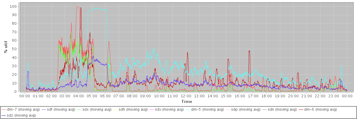 avg(dm-7) = 9.48 avg(sdf) = 8.97 avg(sdx) = 6.24 avg(sdh) = 6.24 avg(sdv) = 9.00 avg(dm-5) = 24.44 avg(sdp) = 6.24 avg(sdn) = 8.96 avg(dm-6) = 11.93 avg(sdz) = 8.98