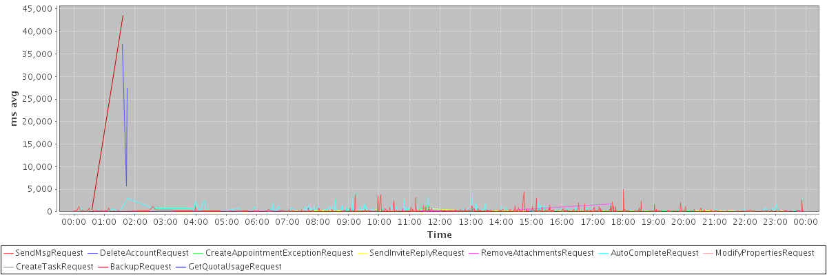 avg(SendMsgRequest) = 236.24 avg(DeleteAccountRequest) = 23391.00 avg(CreateAppointmentExceptionRequest) = 344.50 avg(SendInviteReplyRequest) = 228.84 avg(RemoveAttachmentsRequest) = 406.20 avg(AutoCompleteRequest) = 306.16 avg(ModifyPropertiesRequest) = 215.00 avg(CreateTaskRequest) = 273.00 avg(BackupRequest) = 22060.00 avg(GetQuotaUsageRequest) = 2056.00