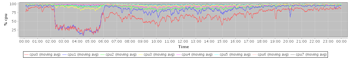 avg(cpu0) = 24.53 avg(cpu1) = 14.39 avg(cpu2) = 1.18 avg(cpu3) = 1.32 avg(cpu4) = 0.43 avg(cpu5) = 0.43 avg(cpu6) = 0.23 avg(cpu7) = 0.28