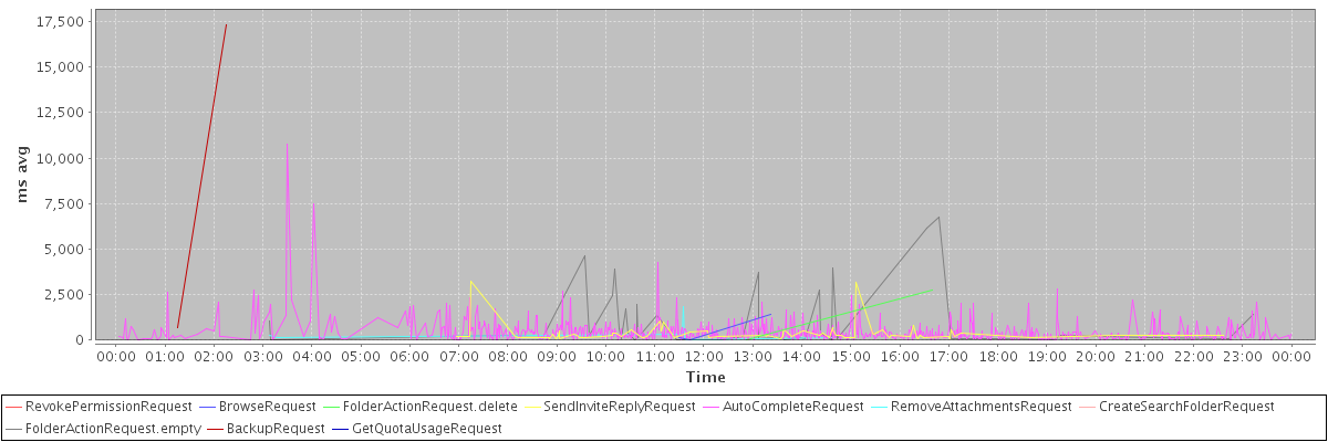 avg(RevokePermissionRequest) = 574.00 avg(BrowseRequest) = 524.00 avg(FolderActionRequest.delete) = 1385.50 avg(SendInviteReplyRequest) = 369.17 avg(AutoCompleteRequest) = 450.27 avg(RemoveAttachmentsRequest) = 407.71 avg(CreateSearchFolderRequest) = 1320.00 avg(FolderActionRequest.empty) = 1066.89 avg(BackupRequest) = 9003.50 avg(GetQuotaUsageRequest) = 1223.00