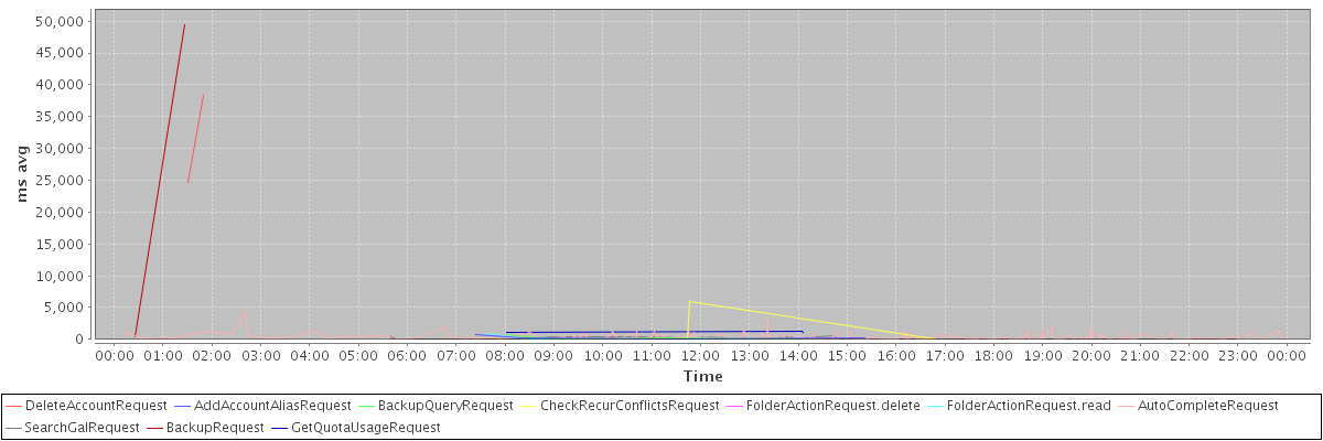 avg(DeleteAccountRequest) = 31461.50 avg(AddAccountAliasRequest) = 272.50 avg(BackupQueryRequest) = 233.60 avg(CheckRecurConflictsRequest) = 1203.20 avg(FolderActionRequest.delete) = 1155.00 avg(FolderActionRequest.read) = 338.67 avg(AutoCompleteRequest) = 296.29 avg(SearchGalRequest) = 223.84 avg(BackupRequest) = 24933.00 avg(GetQuotaUsageRequest) = 1182.00