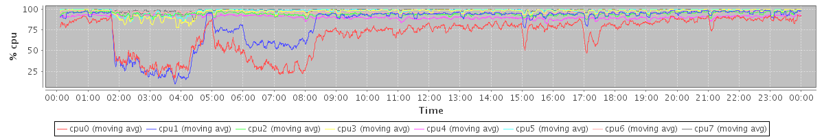 avg(cpu0) = 69.60 avg(cpu1) = 82.29 avg(cpu2) = 94.19 avg(cpu3) = 96.86 avg(cpu4) = 90.41 avg(cpu5) = 98.03 avg(cpu6) = 95.33 avg(cpu7) = 98.71