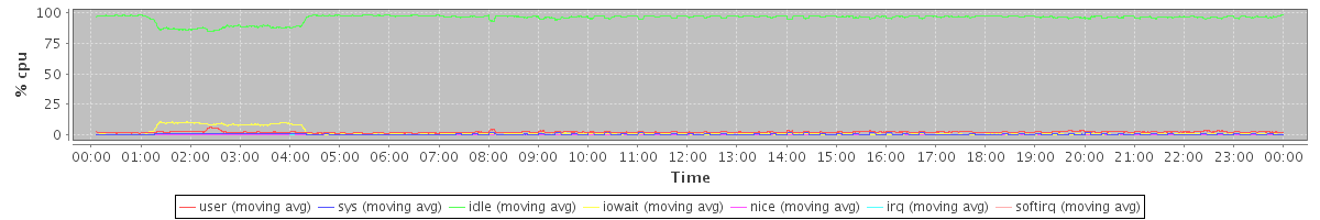 avg(user) = 2.00 avg(sys) = 0.42 avg(idle) = 95.92 avg(iowait) = 1.51 avg(nice) = 0.10 avg(irq) = 0.00 avg(softirq) = 0.03