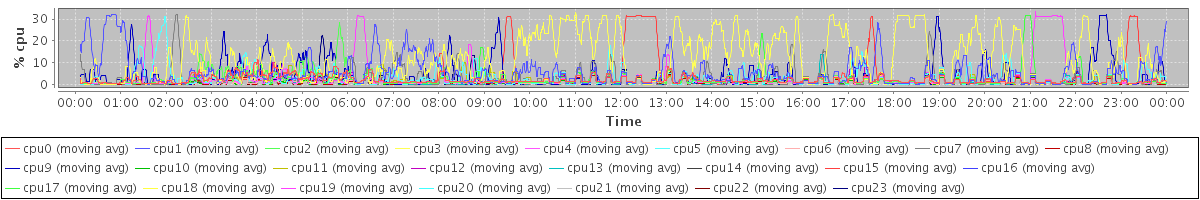 avg(cpu0) = 22.06 avg(cpu1) = 10.33 avg(cpu2) = 1.02 avg(cpu3) = 0.95 avg(cpu4) = 0.75 avg(cpu5) = 0.40 avg(cpu6) = 0.58 avg(cpu7) = 0.45 avg(cpu8) = 0.16 avg(cpu9) = 0.17 avg(cpu10) = 0.11 avg(cpu11) = 11.55 avg(cpu12) = 3.08 avg(cpu13) = 1.08 avg(cpu14) = 0.22 avg(cpu15) = 0.25 avg(cpu16) = 0.30 avg(cpu17) = 0.17 avg(cpu18) = 0.35 avg(cpu19) = 0.82 avg(cpu20) = 0.18 avg(cpu21) = 0.02 avg(cpu22) = 0.15 avg(cpu23) = 1.20