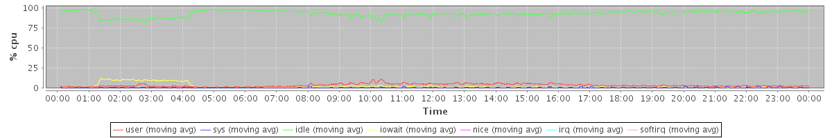 avg(user) = 3.60 avg(sys) = 0.61 avg(idle) = 93.41 avg(iowait) = 2.19 avg(nice) = 0.10 avg(irq) = 0.00 avg(softirq) = 0.08