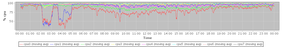 avg(cpu0) = 79.24 avg(cpu1) = 91.70 avg(cpu2) = 89.37 avg(cpu3) = 98.15 avg(cpu4) = 94.42 avg(cpu5) = 98.81 avg(cpu6) = 96.65 avg(cpu7) = 99.12