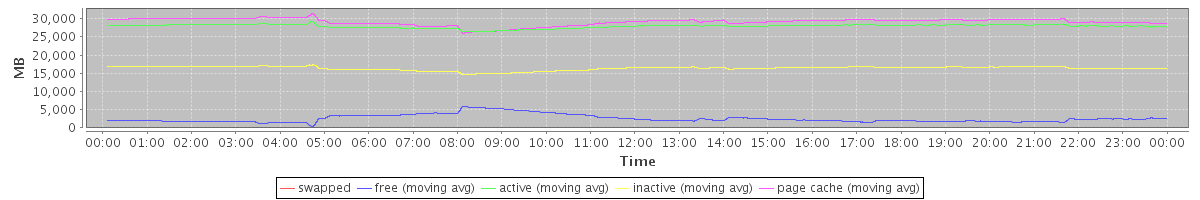 avg(swapped) = 0.00 avg(free) = 2539.69 avg(active) = 27928.77 avg(inactive) = 16359.43 avg(page cache) = 29132.15